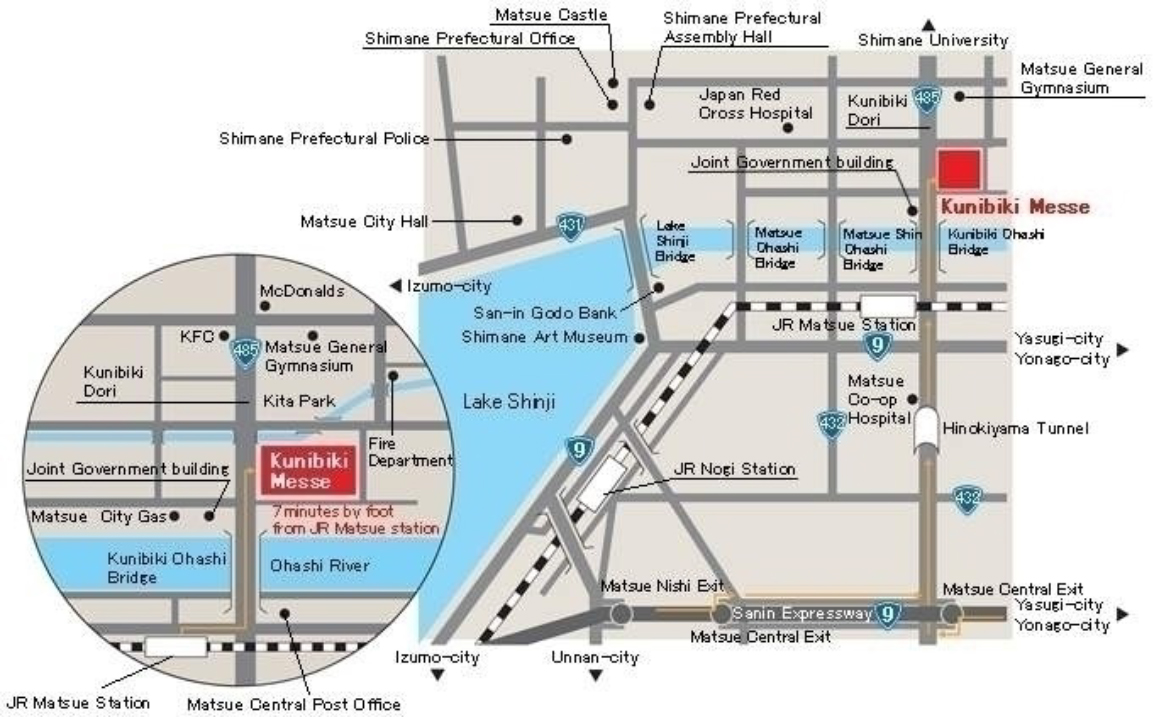 - From JR Matsue station: 3 min. by bus or 7 min. on foot